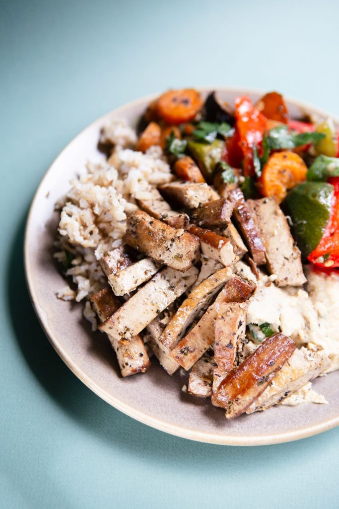 vegán gyros tál (sült tofu zöldségekkel humusszal)