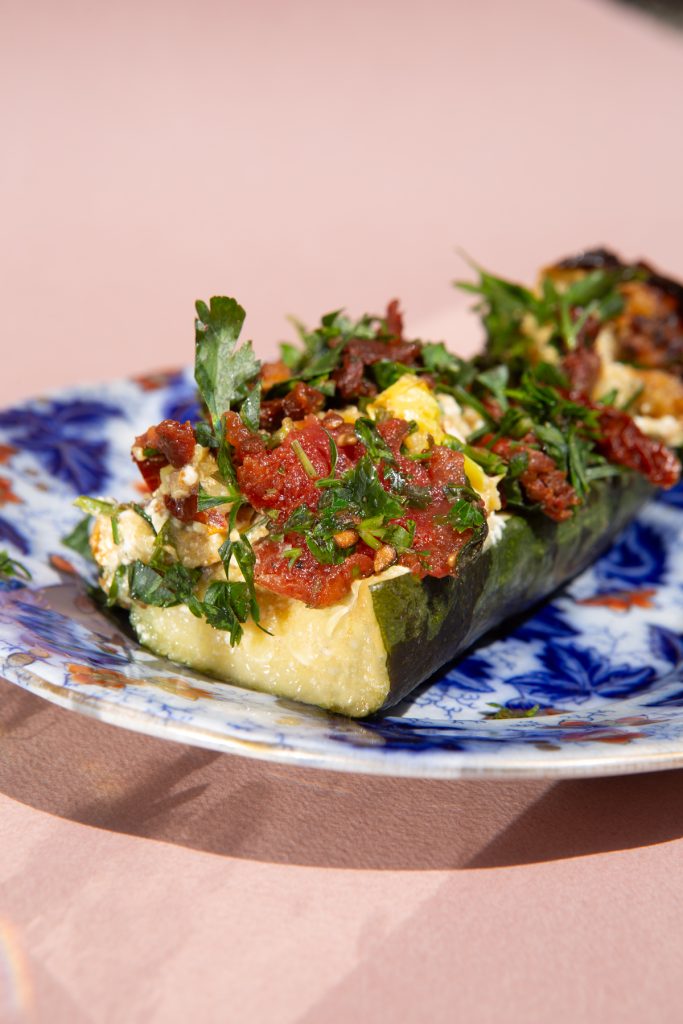 kecskesajtos mediterrán töltött cukkini