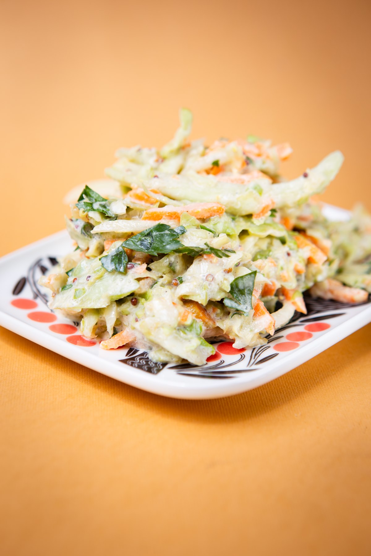 imádnivaló! friss handmade coleslaw saláta ami kellően krémes ropogós, dijoni mustárral és a tojásmentes házi majonézünkkel készül! adunk továbbá tepsiben sült krumplit, valamint a különlegesen édes-ropogós zsályás répa-édeskrumpli fasírtunkat. zseni étel!
