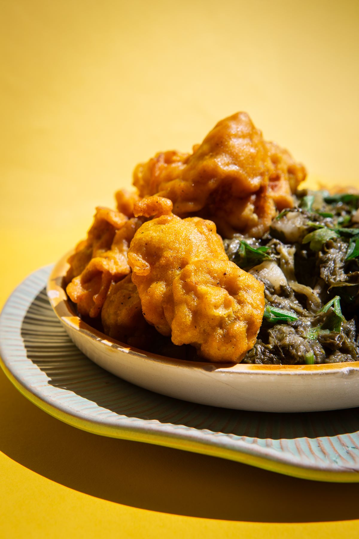 olajban sült és tej, liszt- és tojásmentes csicseri-kukorica-rizsliszt alkotta pakorabundás karfiolt adunk hozzá. . klassz mentes egészséges hazai koszt.