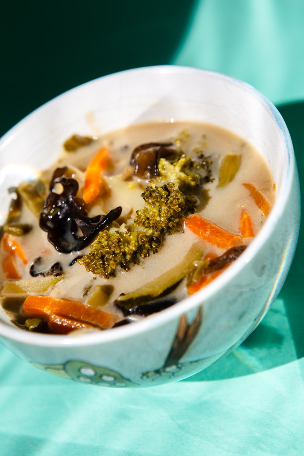 Zsülien (Julienne) csíkokra vágjuk a zöldségeket, már amelyik hagyja magát. gyömbérrel, kókusztejjel, lime-lével készítjük – lehet hogy nem lesz tökéletesen autentikus de annál finomabb és nemsütibb!